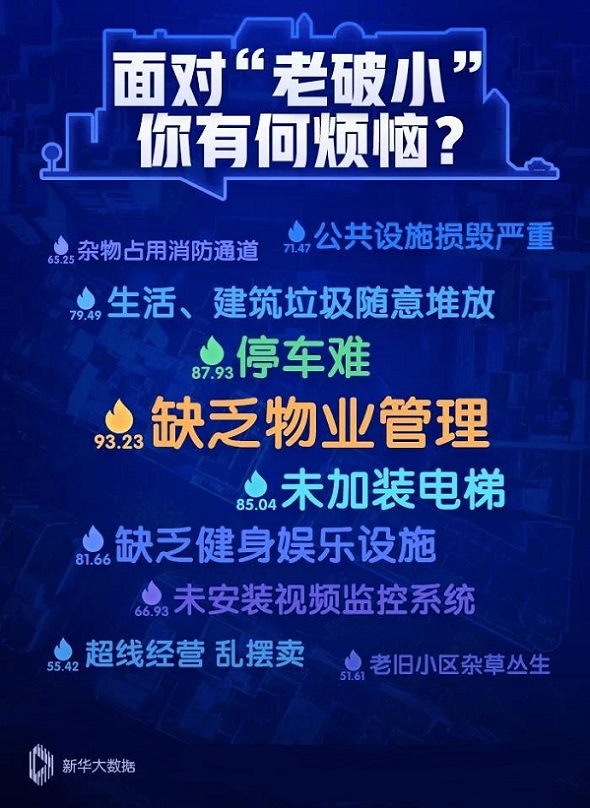新華大數(shù)據(jù)顯示,與“老破小”相關(guān)的話題中,“缺乏物業(yè)管理”、“停車(chē)難”“未加裝電梯”等問(wèn)題被提及次數(shù)最多,話題熱度分別達(dá)93.23、87.93和85.04。