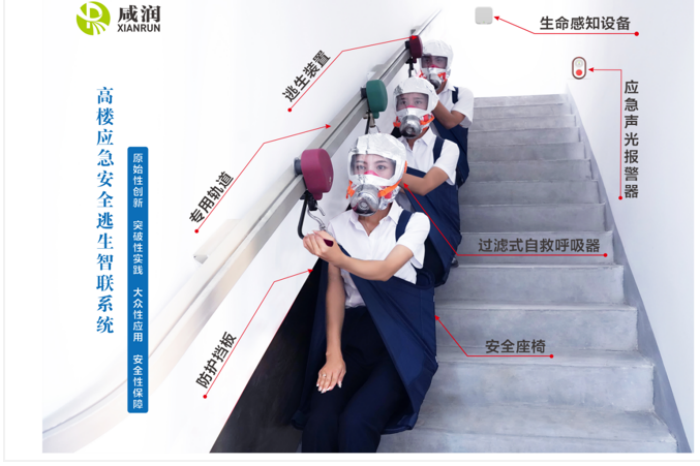 “高樓應急安全逃生智聯(lián)系統(tǒng)”項目,可有效解決高層建筑及各類人員密集場所內涉險人員的群體性緊急疏散難題, 在傳統(tǒng)“防、消、救”的層面上,增加了“逃”的功能。當發(fā)生火災等緊急情況時,第一時間實現(xiàn)聯(lián)動報警,百米高層3分鐘快速逃生,高效有序撤離至地面安全地帶。同時結合物聯(lián)網+功能,對樓內人員進行生命探測、位置追蹤,為消防隊員提供精準救援信息,將主動自救互救和協(xié)同組織救援緊密結合,有效提高救援全過程質效,降低人員密集場所群死群傷重特大火災事故的發(fā)生幾率,扭轉重特大事故多發(fā)被動局面,減少人員傷亡及財產損失,全方面保障人民生命財產安全,填補人員密集場所緊急疏散基礎設施建設空白。