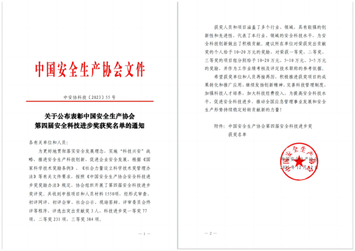 “中國安全生產協(xié)會第四屆安全科技進步獎”!
